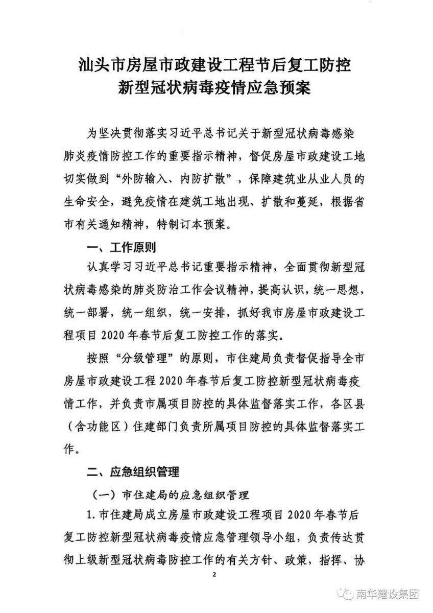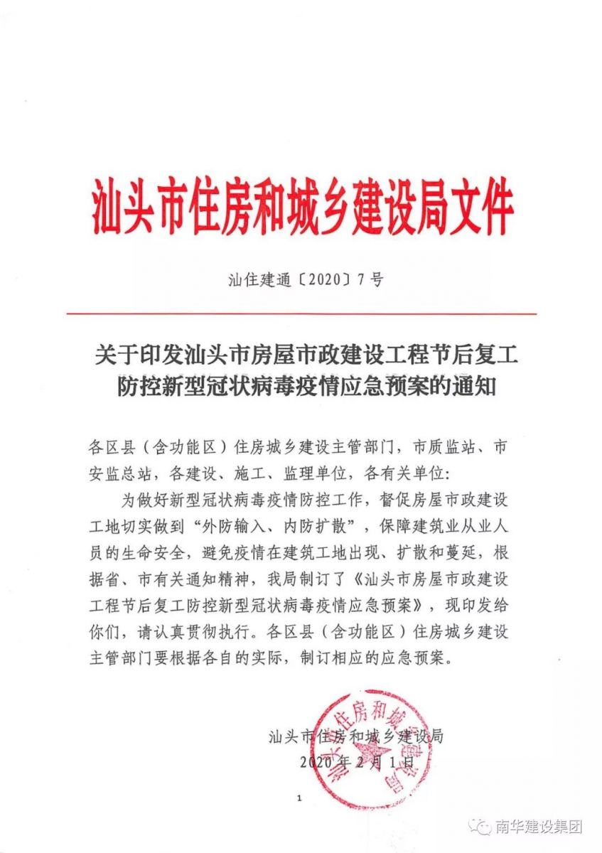 關于印發(fā)汕頭市房屋市政建設工程節(jié)后復工防控新型冠狀病毒疫情應急預案的通知