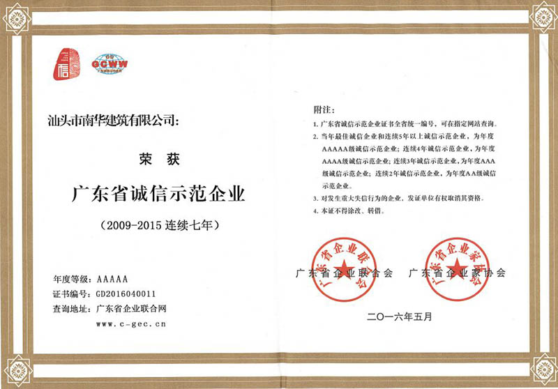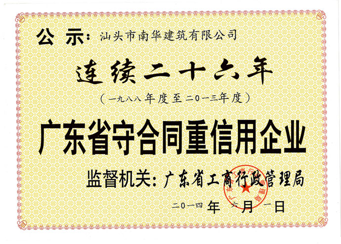 廣東省連續(xù)六年誠信示...