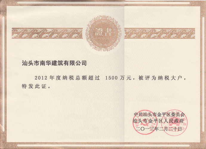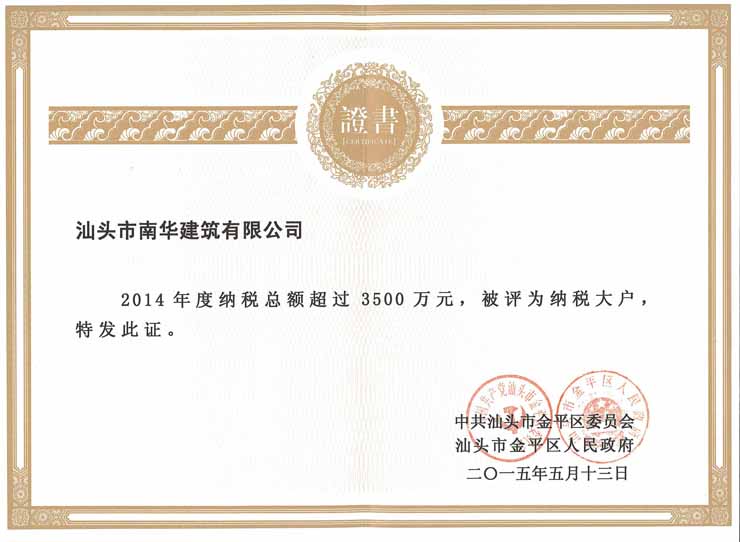 2014年度納稅大戶證書